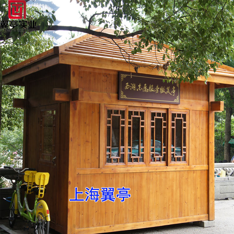全亭以钢结构为基本骨架、用美国花旗松、 樟子松、杉木等上等木材进行炭化或防腐处理后的木材为主要饰面。并根据客户要求用水性漆配色、使之与环境融为一体、多用于旅游景点、公园、度假山庄等不仅具有岗亭的功能,更是一道亮丽的风景线,使人赏心悦目,融入自然感觉。
